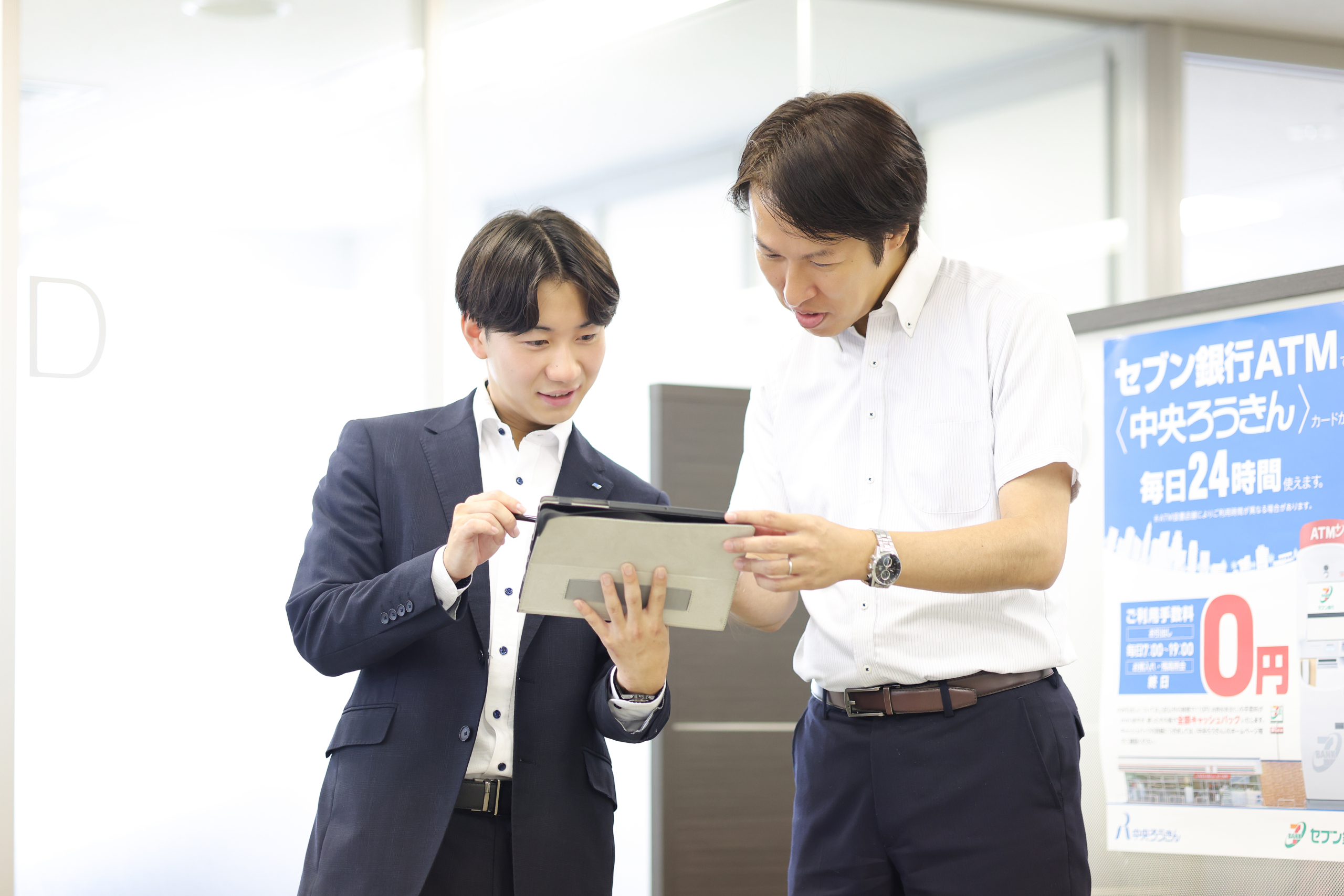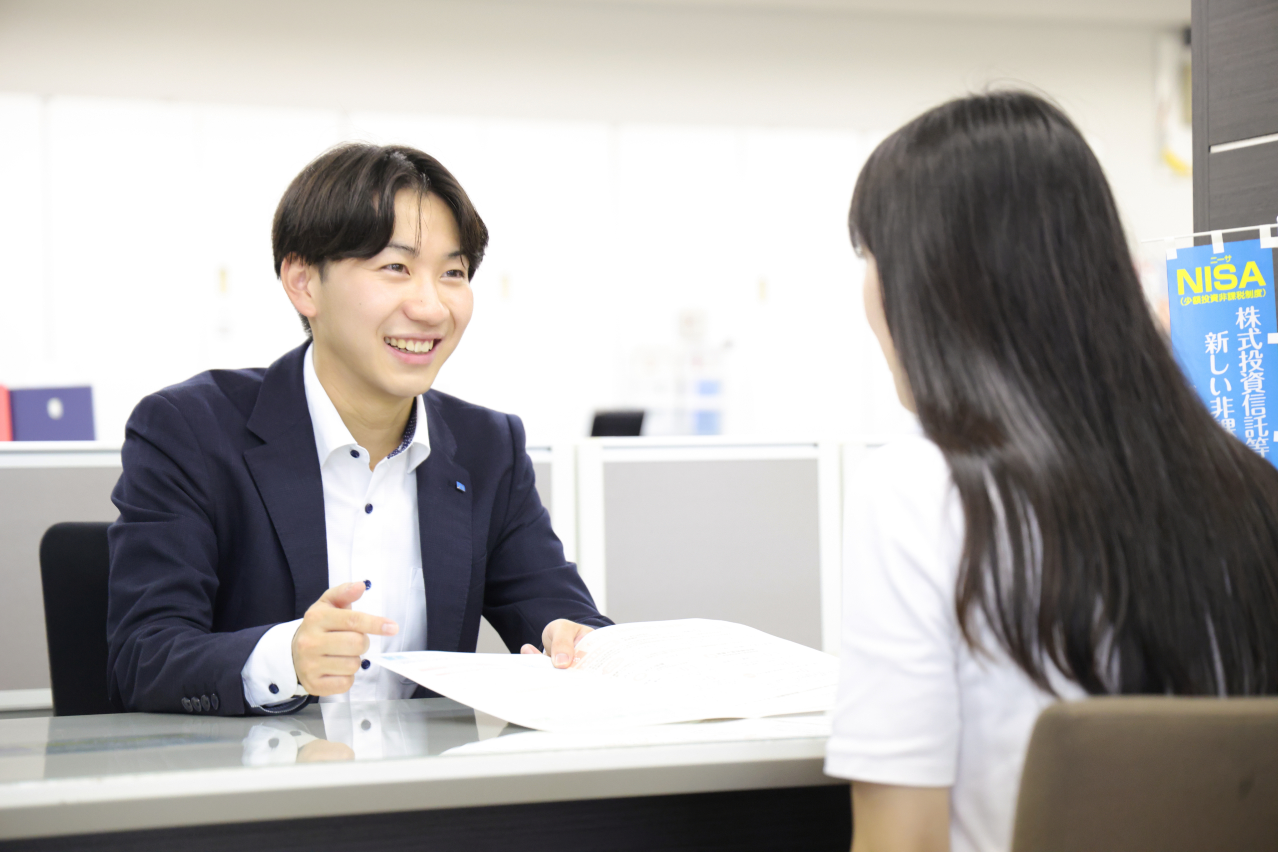 私は現在、住宅ローンの融資を担当しています。不動産業者と関係を構築し、「マイホームを買いたい」という希望を持ったお客様をご紹介いただくことから業務がスタート。住宅ローンに関するご案内を行い、ご融資という形で夢を実現させるお手伝いをしています。中央ろうきんの融資は99%が個人の方を対象としたものです。住宅ローンのお申込で来店いただくお客様の中には、今後の資産形成に不安を感じている方もいらっしゃいます。そのため、住宅ローンだけでなく、お客様の意向に応じた金融商品のご提案も行っており、生涯にわたり選ばれるメインバンクとしてご利用いただけるよう、日々考えながら業務に取り組んでいます。お客様一人ひとりの異なるライフプランに合わせて幅広い提案をできることが、この仕事の魅力です。お客様から笑顔と感謝の言葉をいただく場面も多く、やりがいとおもしろさを実感しやすい環境だと感じています。